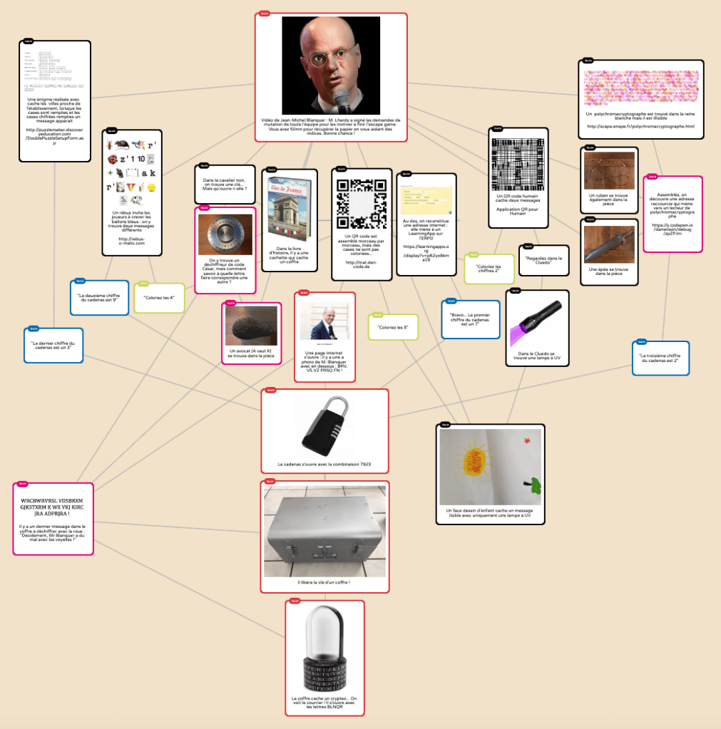 Une fois que je « sens » le truc, je me lance dans l’organigramme (le squelette de l’escape game) : je jette des dessins, des mots, des flèches au crayon de papier sur une feuille A3. C’est très fouillis au début, mais ça se précise avec le temps, les idées abandonnées, adaptées ou rajoutées.