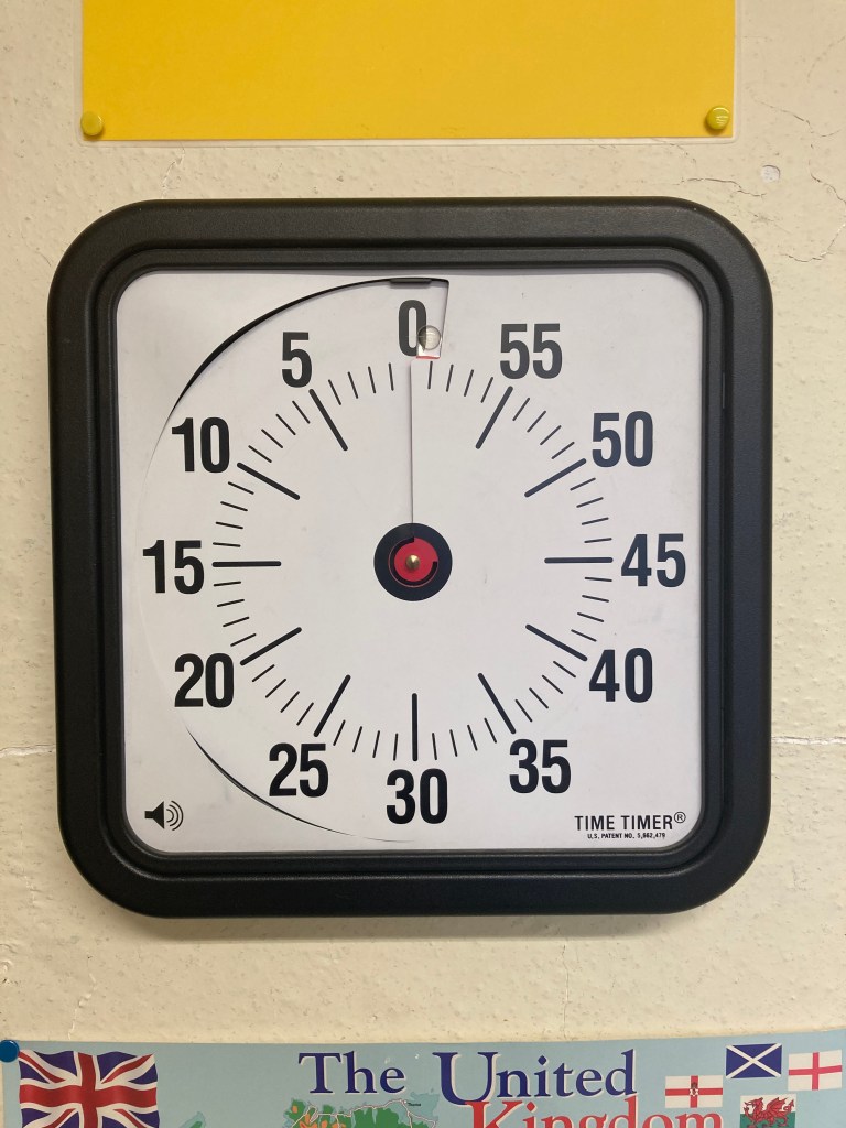 S’il y a une chose qui sert dans ma classe, ce sont les Timers. J’en suis fan ! Cette année, j’ai réintégré ma salle et retiré un poster qui commençait à perdre ses couleurs. Ça a libéré de l’espace sur un mur et j’en ai profité pour les accrocher aux murs , au lieu qu’ils encombrent le haut de mon tableau blanc (et qu’ils tombent) 🕰⏱⏲