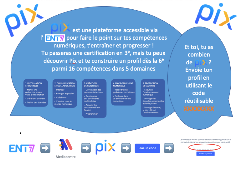 Je partage une affiche au format A4 modifiable pour afficher dans votre établissement le rappel des compétences Pix, où trouver Pix, et communiquer un code unique de recueil des profils 🎁