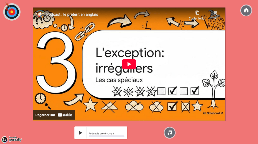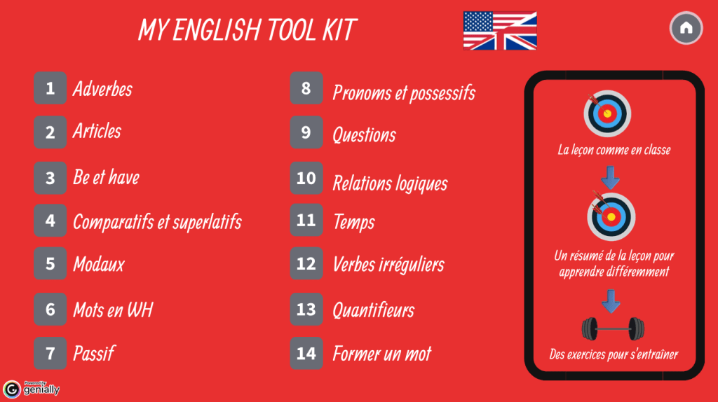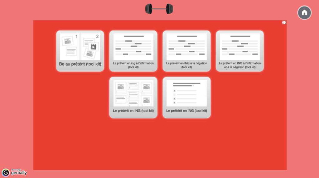 J’ai donc choisi de passer à l’action et de recréer un Tool Kit, cette fois-ci sur Genially (j’ai craqué pendant le Black Friday et je me suis payée une version payante). Je garde la même structure, à savoir la leçon en version courte et simple sur une ou plusieurs pages, et j’ajoute quand je les ai des collections de LearningApps pour s’entraîner.