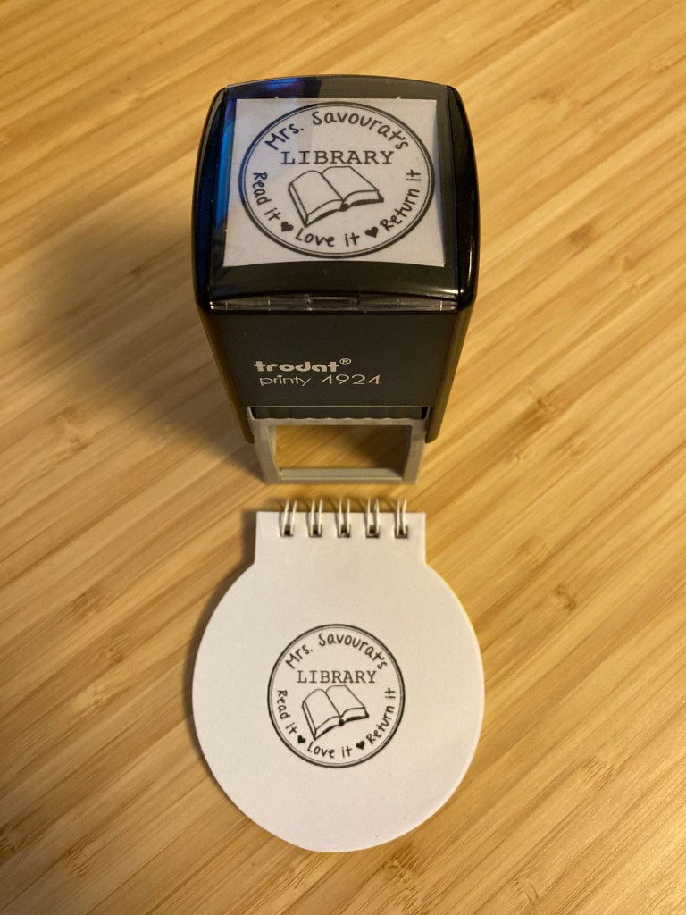 Chaque ouvrage (à l’exception des magazines) est plastifié (matériel acheté par le collège), tamponné avec le tampon au nom de ma classroom library 😎 et rentré dans la base grâce à une étiquette avec un code-barres et un numéro collé sur la couverture.